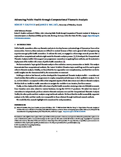 Public health researchers often use thematic analysis to develop human understandings of discussions from online communities. However, these analyses are difficult to conduct because of their and a general lack of programming expertise amongst public health researchers. To address this need, we engaged in a three stage research process that 1) explored how computational methods might assist the thematic analysis process \cite{gauthier2022will}, 2) developed the Computational Thematic Analysis toolkit \cite{gauthier2022computational} to support non-programmer researchers in applying those methods, and 3) conducted a deployment of the toolkit with a team of public health researchers \cite{gauthier2023agency}.