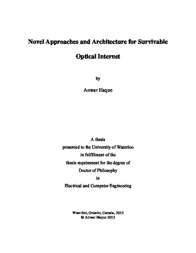 This thesis proposes a novel survivable routing architecture for the optical Internet. We focus on a number of key issues that are essential to achieve the desired service scenarios, including the tasks of (a) minimizing the total number of wavelengths used for establishing working and protection paths in WDM networks; (b) minimizing the number of affected working paths in case of a link failure; (c) handling large scale WDM mesh networks; and (d) supporting both Quality of Service (QoS) and best-effort based working lightpaths. To implement the above objectives, a novel path based shared protection framework namely Group Shared protection (GSP) is proposed where the traffic matrix can be divided into multiple protection groups (PGs) based on specific grouping policy, and optimization is performed on these PGs. To the best of our knowledge this is the first work done in the area of group based WDM survivable routing approaches where not only the resource sharing is conducted among the PGs to achieve the best possible capacity efficiency, but also an integrated survivable routing framework is provided by incorporating the above objectives. Simulation results show the effectiveness of the proposed schemes.