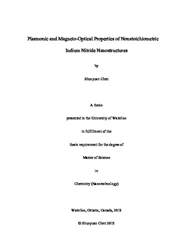 Localized surface plasmon resonance (LSPR) in semiconductor nanostructures have attracted intense attention recently for its broad application in bio-imaging, chemical sensing, photocatalysis, and photovoltaics. Compared to the LSPR in metallic nanocrystals (NCs), LSPR in semiconductor NCs is highly tunable in the infrared region by tailoring chemical composition and stoichiometry. Moreover, LSPR along with external magnetic field allows the exploration of magneto-plasmonic coupling in single-phase semiconductors, opening up the magneto-optical ways to control charge carriers. In this thesis, we focus on the LSPR as well as magneto-optical properties of indium nitride (InN), providing valuable insights into the insufficiently researched III-V group semiconductors. Wurtzite phase InN NCs were successfully synthesized using the low-temperature colloidal method, and the plasmon intensity is tunable by changing the synthesis environment and varying doping concentrations of aluminum and titanium ions. Due to the combined effects of conduction band non-parabolicity and intraband transition, our InN NCs with different plasmon intensities have an almost fixed plasmonic energy of 0.37 eV. Besides, the optical bandgap of pure InN NCs ranges from 1.5 to 1.75 eV, depending on the reaction conditions, while that of the Al and Ti-doped InN varies from 1.65 to 1.85 eV. The plasmon-dependent phonon change is evaluated by the Raman spectroscopy. Differences in the longitudinal-optical (LO) phonon mode was observed for InN with high and low plasmon intensity. The magneto-optical properties of InN NCs were measured by the magnetic circular dichroism (MCD). The field-dependence and temperature-independence of the measured MCD spectra were investigated, and the plasmon-induced polarization of carriers was demonstrated. Tuning of the carrier polarization by varying LSPR and external magnetic field corroborates the hypothesis of non-resonant coupling between plasmons and excitons in a single-phase semiconductor. The results of this work demonstrate that LSPR can act as a degree of freedom in manipulating electrons in technologically-important III-V nanostructures and lead to potential applications in photonics and quantum computing at room temperature. Finally, InN nanowires (NWs) with LSPR were fabricated via low-temperature chemical vapor deposition (CVD) approach, laying the groundwork for the future research of LSPR and magneto-plasmonics in a one-dimensional system.