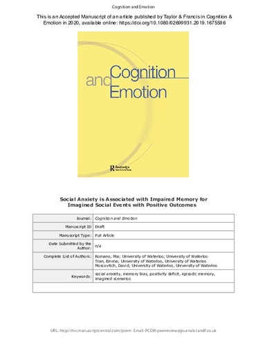Social Anxiety is Associated with Impaired Memory for Imagined Social Events with Positive Outcomes